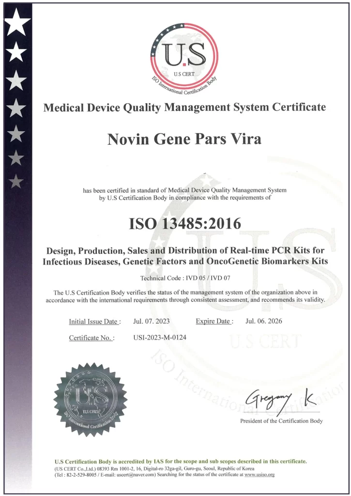 NovinGene proudly upholds the highest standards of quality with our ISO 13485:2016 certification. This accreditation underscores our commitment to excellence in the design, development, and production of qPCR molecular kits, ensuring reliability and regulatory compliance.